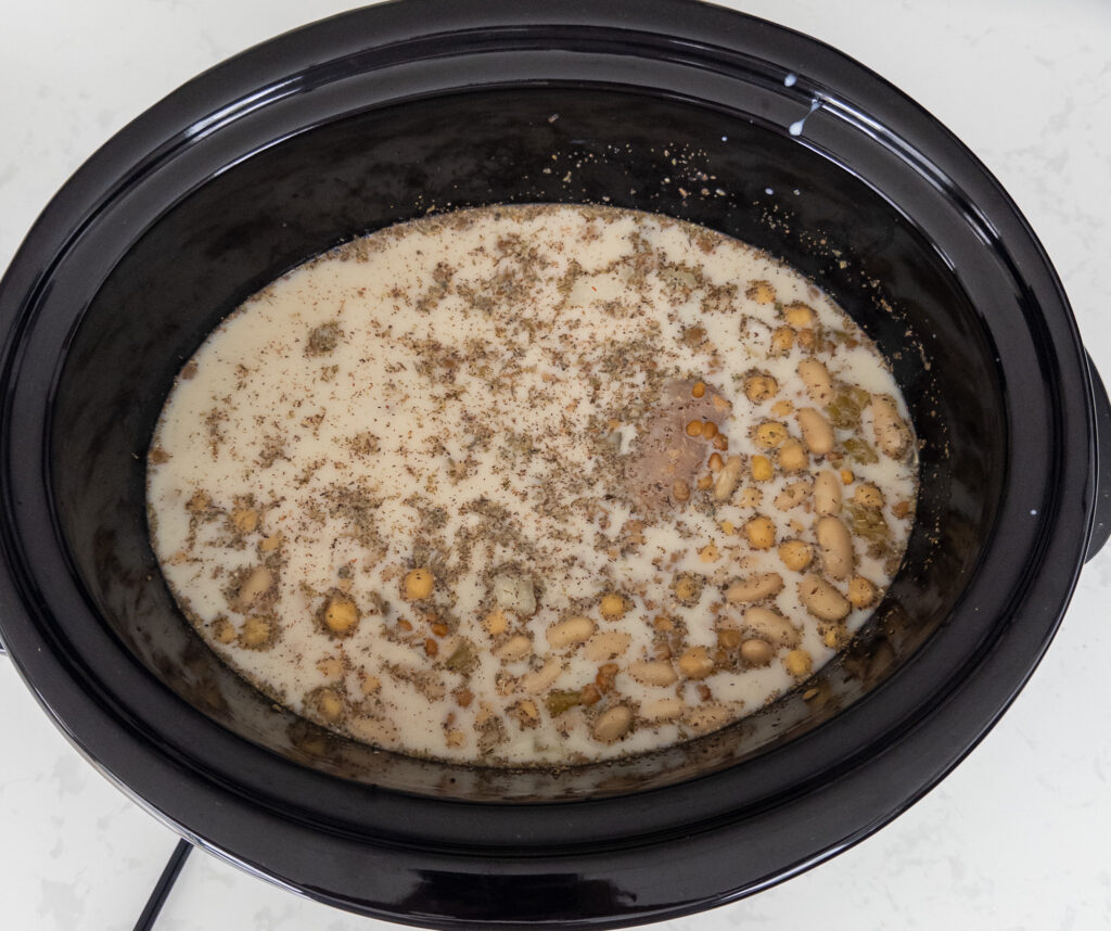 Pour the drained beans, chickpeas, lentils, and diced green chiles over the chicken. Add the chicken broth and milk. Stir gently to combine.
