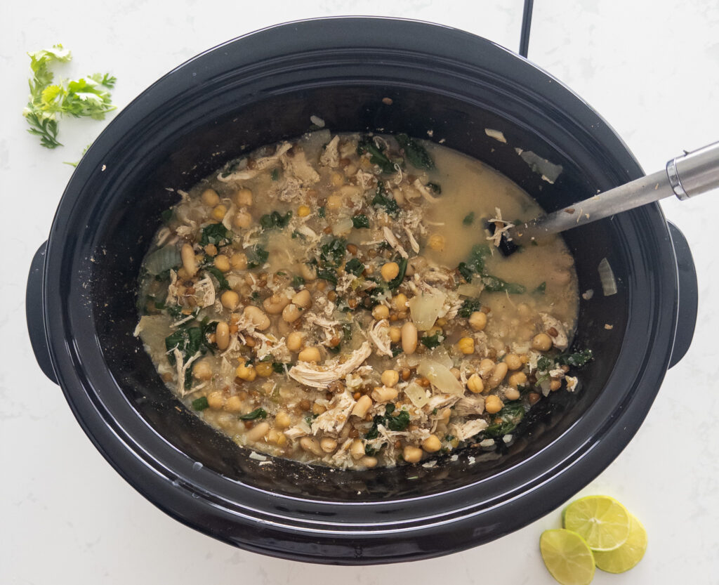 Stir in the frozen cauliflower rice and chopped spinach. Cover and cook for an additional 30 minutes on low until the spinach is wilted and the cauliflower rice is tender.